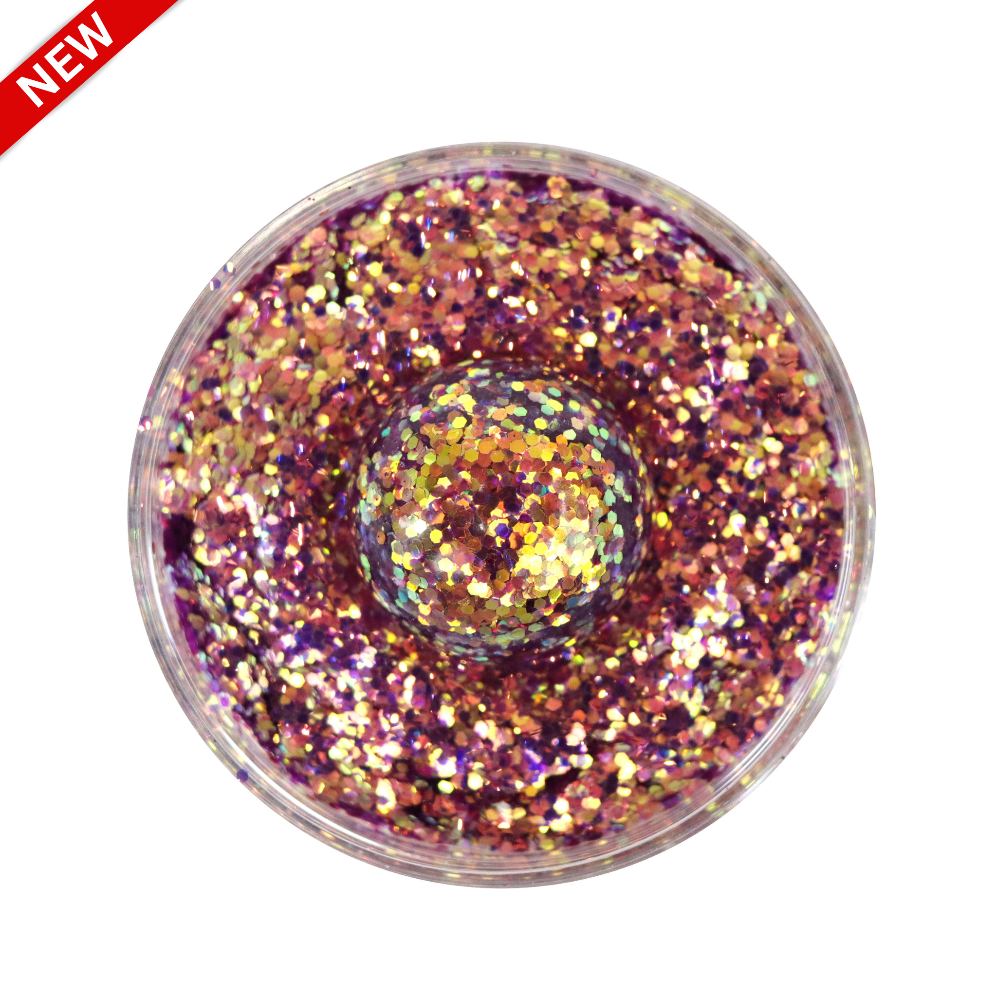 Phoenix is a chunky holographic glitter that creates a multidimensional, color-shifting effect. As you move, the color shifts with you. Phoenix has a magenta base. At certain angles, it reflects violet, pink, orange, bright gold and teal.